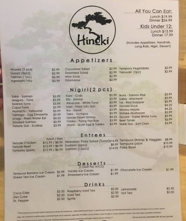 Hinoki Sushi is open on Monday, Tuesday, Wednesday, Thursday, Friday, Saturday and Sunday from 11:00 AM - 9:00 PM.